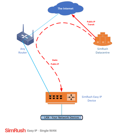 Effortlessly achieve a fixed/static public IP address with SimRush Easy IP. Designed for seamless integration with any router, this compact device ensures reliable connectivity across various internet types—including 4G/5G, fixed broadband, Starlink, satellite, and more.