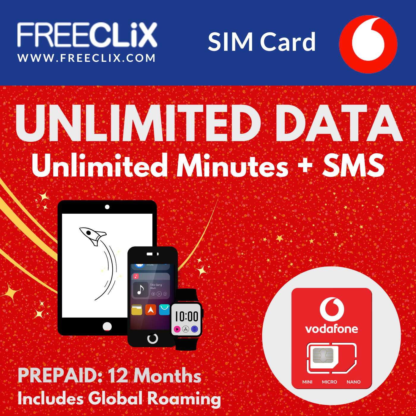 Vodafone Unlimited Data + Minutes & Texts + RLAH. Pre-Paid.